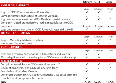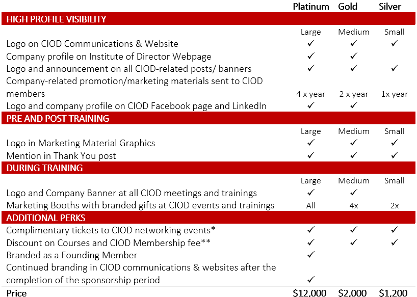 This sponsorship is an exclusive and unique opportunity for your company to show its commitment to good corporate governance in Cambodia through playing a key role in the establishment of the Cam-IoD. Each founding sponsor has exclusivity in their business sector. There are multiple, exclusive benefits for this select group of companies. Unlike with other sponsorships, residual benefits extend for ten years.